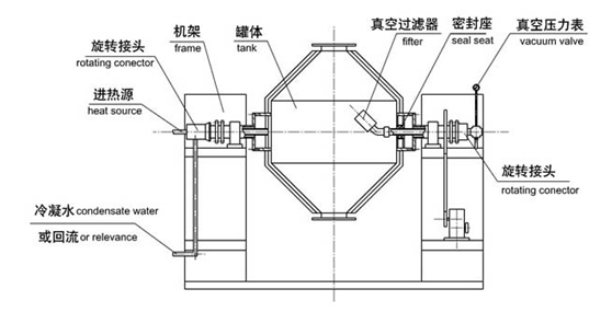 锂电池材料专用回转真空干燥机的工作原理是在密闭的夹层中通入热源,热量经内壳传给被干燥物料,物料从接触的器壁内表面接收热量,在动力驱动下,罐体作缓慢旋转,罐内物料不断地混合,从而达到强化的目的;物料在真空状态下,不断翻转,气压下降使物料表面的溶剂达到饱和状态而蒸发了,湿物料吸热后蒸发的水汽,通过真空泵经真空排气管被抽走。物料内部的溶剂不断地向表面渗透、蒸发、排出,三个过程不断进行,从而加快物料的干燥,物料短时间内达到干燥目的。比静态真空干燥机节省大量时间,提高劳动生产力。